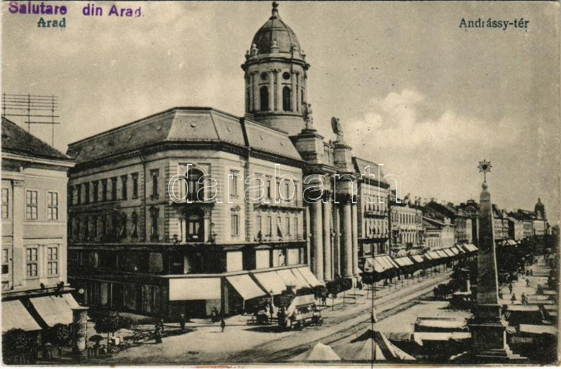 Arad, Andrássy tér, Minorita templom, autóbusz, üzletek, piac. Kerpel Izsó kaidása / square, church, autobus, shops, market (EK)