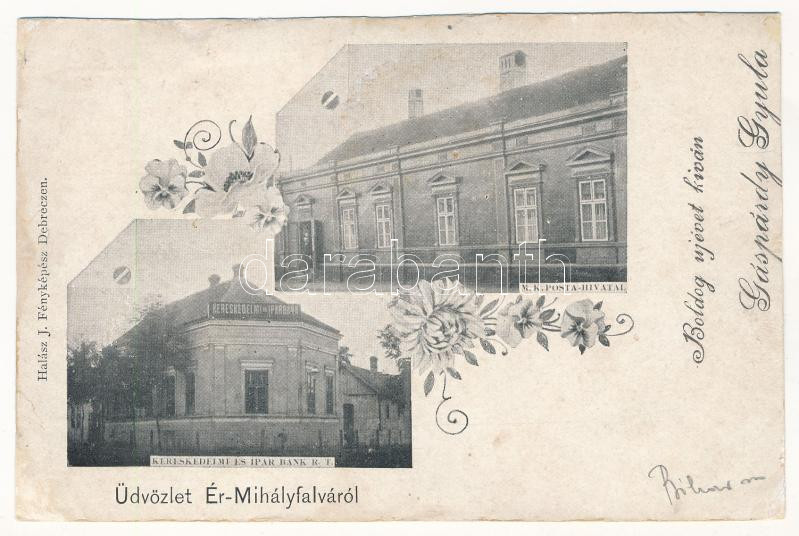 Érmihályfalva, Valea lui Mihai; Kereskedelmi és Iparbank R.-T., M. kir. postahivatal. Halász J. fényképész / bank, post office. Art Nouveau, floral (r)