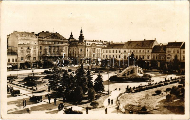 Beschreibung: Kolozsvár, Cluj; Mátyás király tér, autók, New York szálloda, Deutsch üzlete, gyógyszertár / square, shops, hotel, pharmacy (EK)
