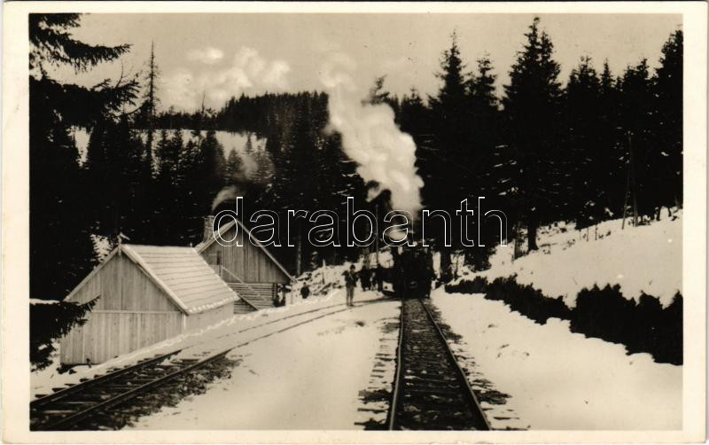 Beschreibung: Kommandó, Komandó, Comandau; iparvasút télen, gőzmozdony, vonat. Lichtenstein Henrik kiadása / industrial railway in winter, locomotive, train