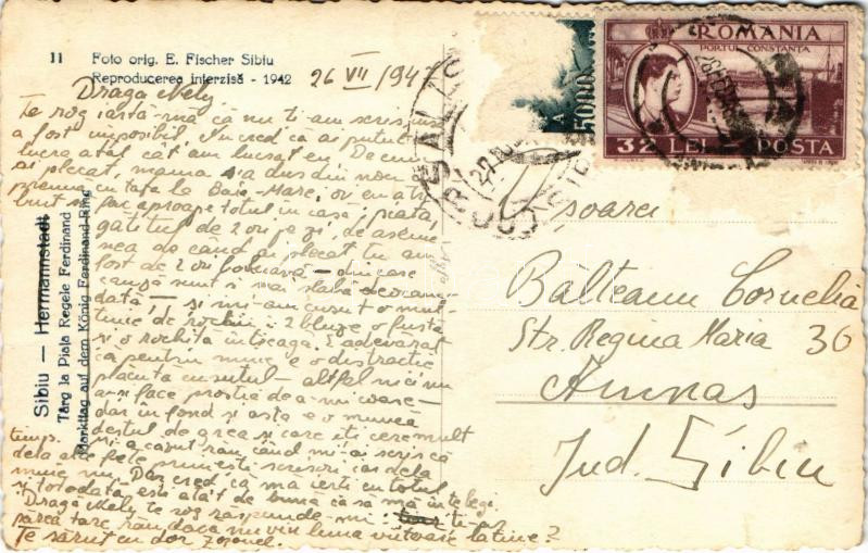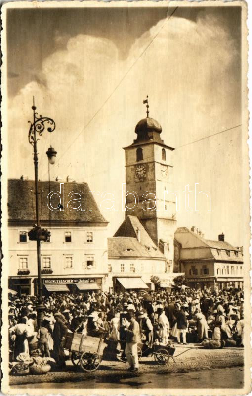 Nagyszeben, Hermannstadt, Sibiu; Targ la Piata Regele Ferdinand / Markttag auf dem König Ferdinand Ring / Piac, vásár a téren, Rudolf Nussbacher Ideal és Carl F. Jickeli üzlete. Foto orig. E. Fischer 11. 1942. / market, shops (Rb)