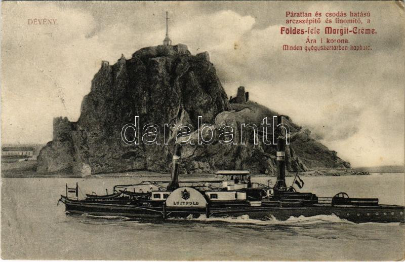 Beschreibung: 1911 Dévény, Theben a. d. Donau, Devín (Pozsony, Bratislava); vár, LUITPOLD oldalkerekes vontató gőzhajó / hrad / castle, side wheeler steam tug, steamship (EK)