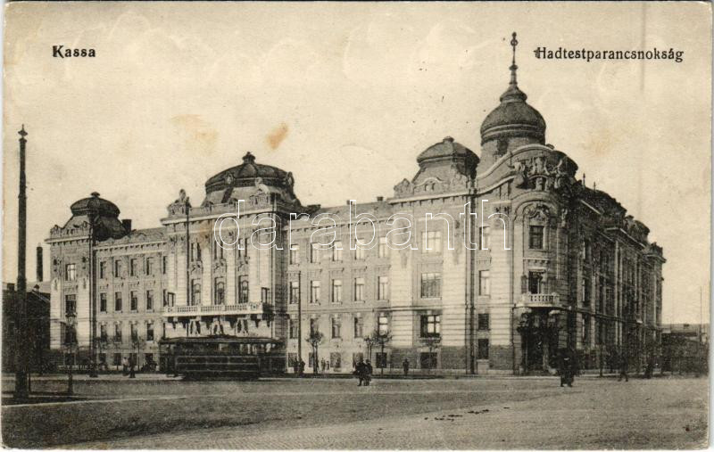 1915 Kassa, Kosice; Hadtestparancsnokság, villamos. Özv. Bodnár Ferenc... https://www.darabanth.com/de/437-Fernauktion/437.0/Ansichtskarten/Slowakei~1500007/1915-Kassa-Kosice-Hadtestparancsnoksag-villamos-Ozv-Bodnar-Ferencne-kiadasa-Kuk-milit~II2807398
