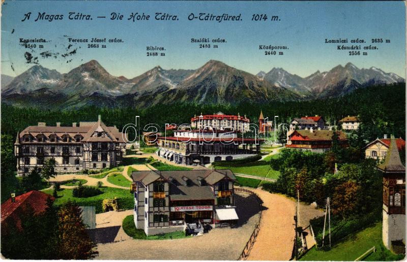 Beschreibung: 1916 Tátrafüred, Ótátrafüred, Altschmecks, Stary Smokovec (Magas Tátra, Vysoké Tatry); kávéház, Kertész Tódor üzlete / Kaffeehaus / café, shop