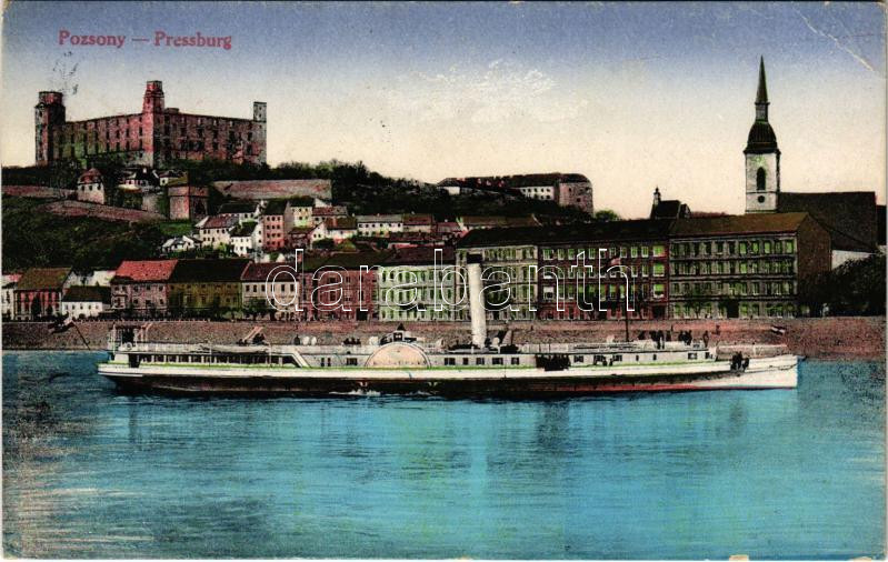 Beschreibung: 1917 Pozsony, Pressburg, Bratislava; vár, "HILDEGARDE" lapátkerekes gőzhajó / castle, Danube, Hungarian steamship (EK)