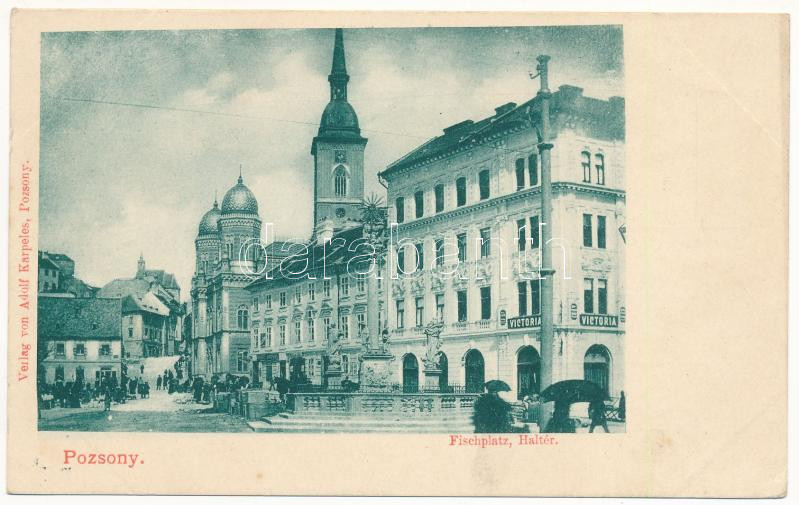 Pozsony, Pressburg, Bratislava; Fischplatz / Hal tér, zsinagóga, Victoria szálloda, piac, üzletek. Adolf Karpeles kiadása / square, synagogue, hotel, market, shops (EK)