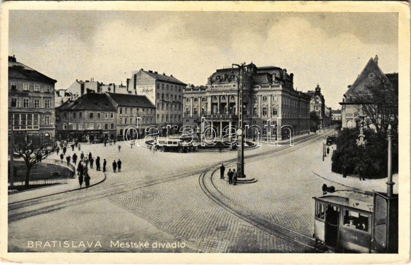 Pozsony, Pressburg, Bratislava; Mestské divadlo / Városi színház, autóbusz, villamos, gyógyszertár, Seifert üzlete / theatre, shops, bus, tram, pharmacy (EK)