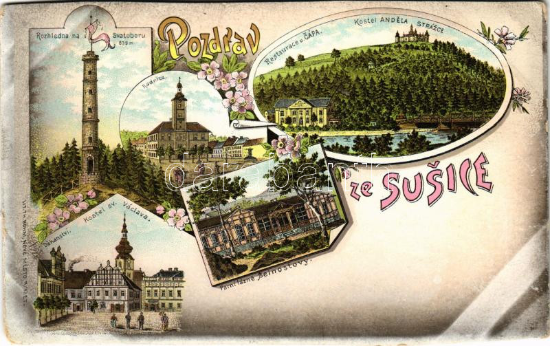 Susice, Schüttenhofen; Rozhledna na Svatoboru, Radnice, Dekanství, Kostel sv. Václava, Radnice, Parní lázné Seinostovy, Restaurace u. Cápa, Kostel Andélia Strazce / tower, town hall, spa, churches, restaurant. Art Nouvea, floral, litho (cut)