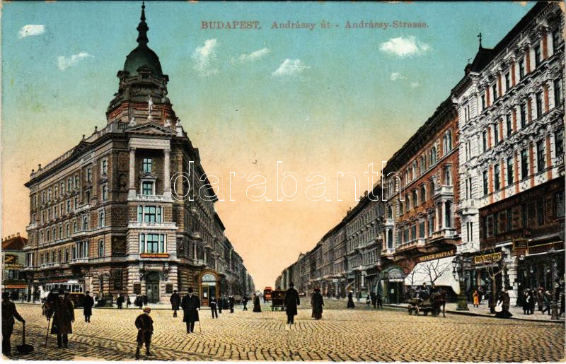 1913 Budapest VI. Andrássy út, villamos, üzletek (EK) https://www.darabanth.com/de/437-Fernauktion/437.0/Ansichtskarten/Ungarn~1500005/1913-Budapest-VI-Andrassy-ut-villamos-uzletek-EK~II2850947