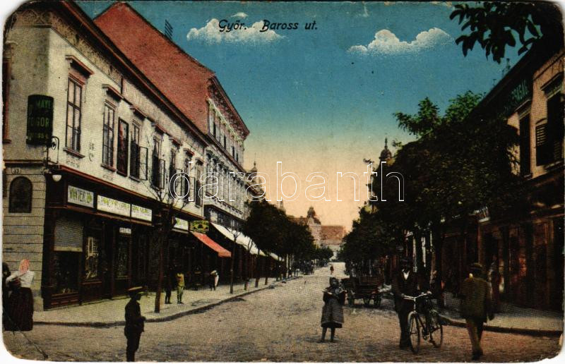 Beschreibung: 1918 Győr, Baross út, kerékpáros férfi, Dr. Mayer fogorvos, Winter Z., Arnady Flórián, Beck Nővérek, Bíró Pál és Strausz Jenő üzlete (b)