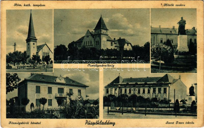 1939 Püspökladány, Római katolikus templom, Osztálymérnökség, Hősök szobra, emlékmű, Főszolgabírói hivatal, Szent Imre iskola. Özv. Hartmann Ignácné kiadása (EK)