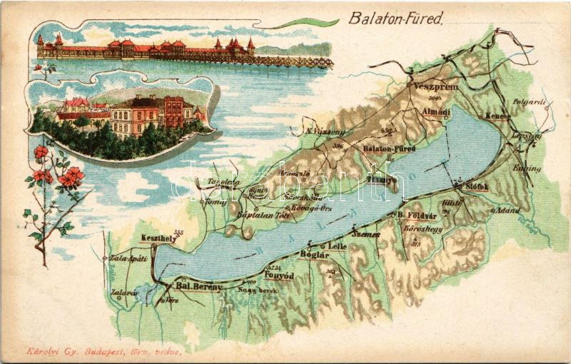 Beschreibung: Balatonfüred, Balaton térkép, szálloda, villa, fürdő. Károlyi Gy. kiadása. Art Nouveau, floral, litho (fl)