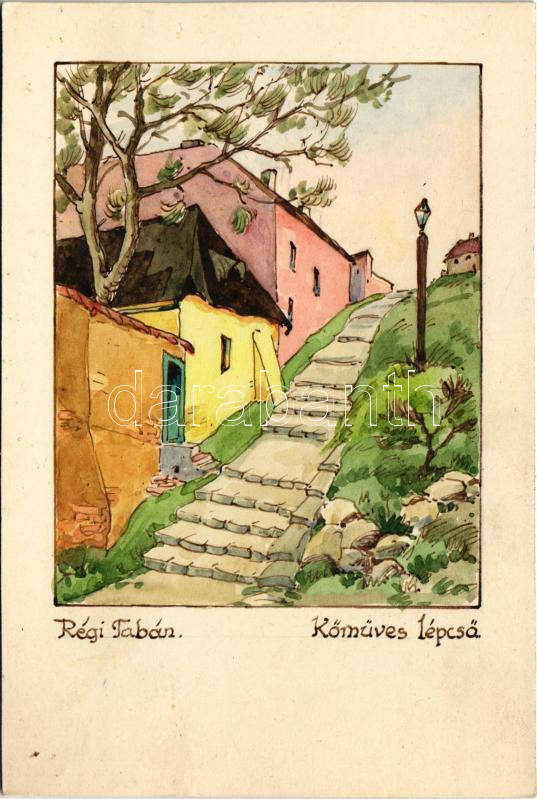 Budapest I. Régi Tabán, Kőműves Lépcső. Kézzel rajzolt és festett művé... https://www.darabanth.com/de/437-Fernauktion/437.0/Ansichtskarten/Ungarn~1500005/Budapest-I-Regi-Taban-Komuves-Lepcso-Kezzel-rajzolt-es-festett-muveszlap-non-PC~II2851995