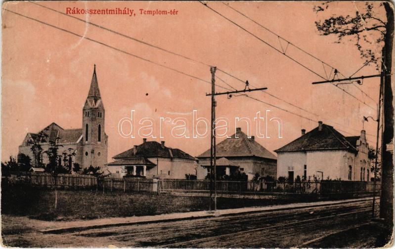 Beschreibung: Budapest XVI. Rákosszentmihály, Templom tér, villamossín. Faragó Gyula kiadása (EB)