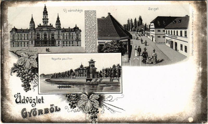 Győr, Sziget, Új városháza, Regatta pavilon. Art Nouveau, floral litho https://www.darabanth.com/de/437-Fernauktion/437.0/Ansichtskarten/Ungarn~1500005/Gyor-Sziget-Uj-varoshaza-Regatta-pavilon-Art-Nouveau-floral-litho~II2795418