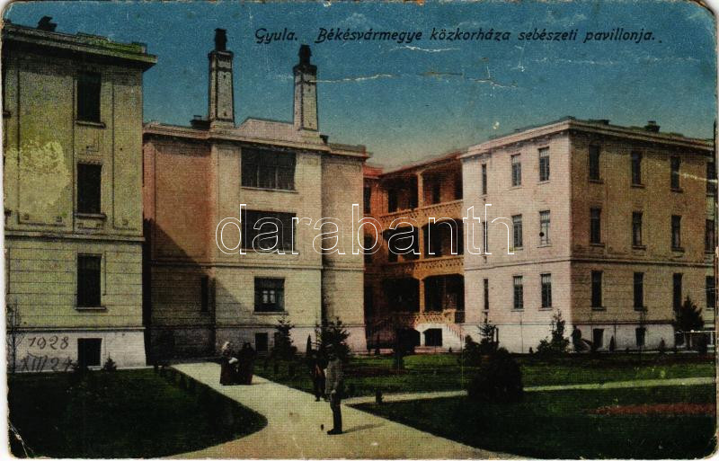 Gyula, Békés vármegye közkórháza, sebészeti pavilon (Rb) https://www.darabanth.com/de/437-Fernauktion/437.0/Ansichtskarten/Ungarn~1500005/Gyula-Bekes-varmegye-kozkorhaza-sebeszeti-pavilon-Rb~II2843362