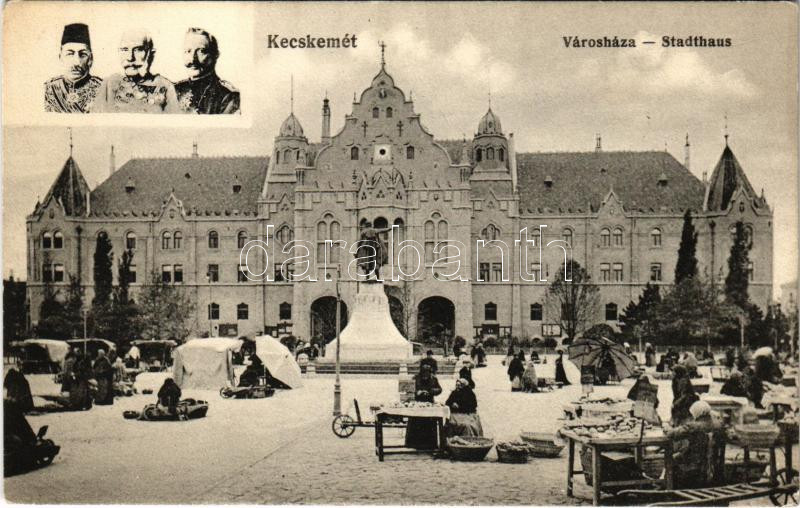 Kecskemét, Városháza, piac. Viribus Unitis és Központi Hatalmak propaganda V. Mehmed, Ferenc József és II. Vilmos portréjával. Fekete Soma kiadása (EK)