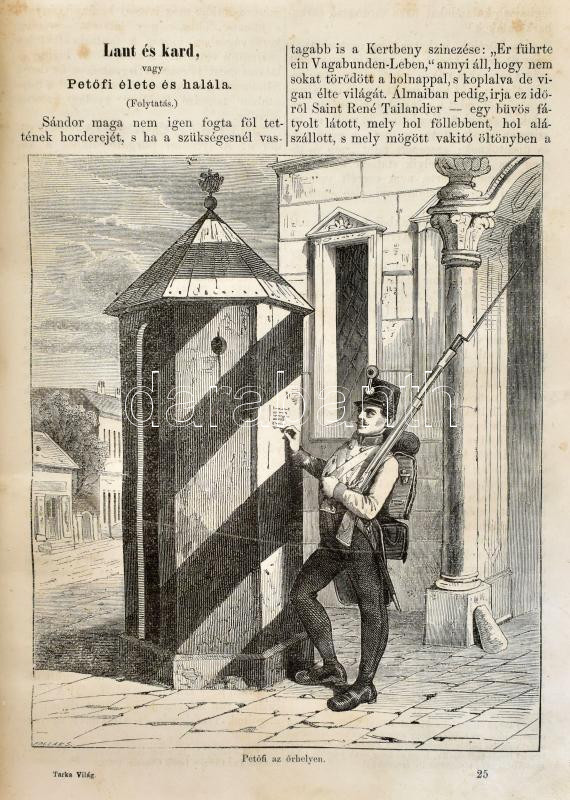 1869 Tarka Világ és Képes Regélő. Szerk.: Áldor Imre. Első évfolyam. (Több évfolyam nem jelent meg!) Pest, 1869, Heckenast Gusztáv, 7-464,521-544 p. (Kb. fél évfolyam, a teljes évfolyam 1152 oldal). Rendkívül gazdag, impozáns szövegközi és egész -, és kétoldalas illusztrációkkal. Dekoratív, aranyozott kissé kopott egészvászon-kötésben, foltos, több helyen javított lapokkal, javított kötéssel.