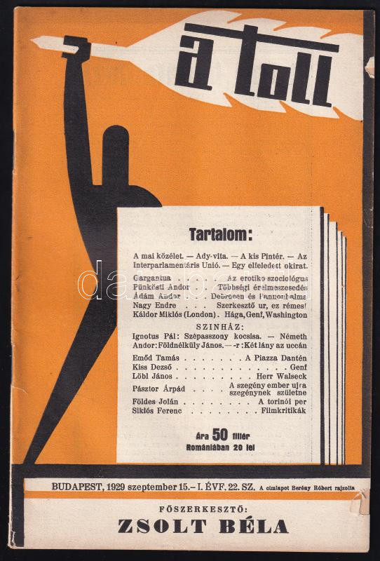 1929 A Toll c. irodalmi folyóirat I. évf. 22. száma, 1929. szept. 15. Szerk.: Kaczér Vilmos. A címlap Berény Róbert munkája. Bp., Globus-ny., 42+(2) p. Kiadói tűzött papírkötés, a borítón kis sérüléssel.