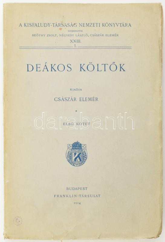Deákos költők. Első kötet: Rájnis, Baróti Szabó, Révai versei. Kiadja: Császár Elemér. A Kisfaludy-Társaság Nemzeti Könyvtára XXIII. Bp., 1914. Franklin-Társulat, 351 p.+1 t. Unicus, több kötete nem jelent meg! Kiadói papírkötés, helyenként kissé sérült lapszélekkel.