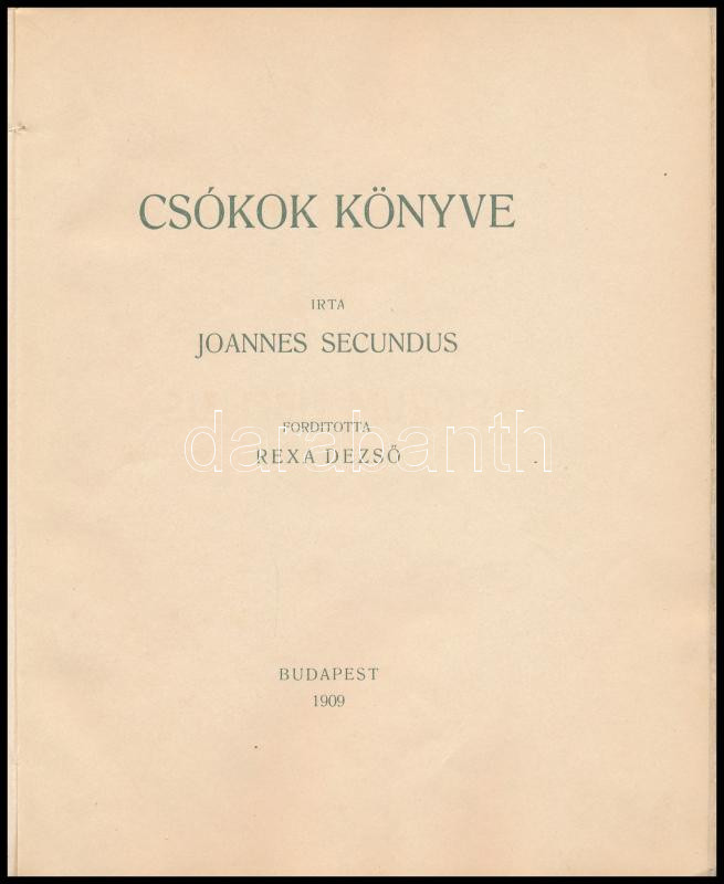 Joannes Secundus: Csókok könyve. Ford.: Rexa Dezső. Bp., 1909., (Kassa, Felsőmagyarországi Napilap-ny.), 1 t. + 74 p. Kiadói papírkötésben, kiadói sérült, foltos papír védőborítóban, a lapok előtt hártyapapírral. "E könyvből 1-25 sorszámmal jelzett amateur példány és 26-300 sorszámmal jelzett díszpéldány készült. A jelen példány sorszáma: 187."