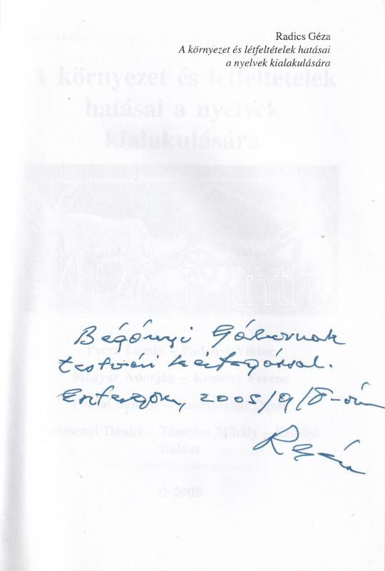 Radics Géza: A környezet és létfeltételek hatásai a nyelvek kialakulására. Szerk.: - -. A szerkesztő, Radics Géza által DEDIKÁLT példány. Pecze László, Padányi Viktor, Magyar Adorján, Forrai Sándor, Kosztolányi Dezső, Berzsenyi Dániel, Táncsics Mihály, Erdélyi Balázs. Chicago, 2005., Magyar Szabadságharcos Szövetség - Szabad Magyar Református Egyház. Emigráns kiadás. Kiadói papírkötés.
