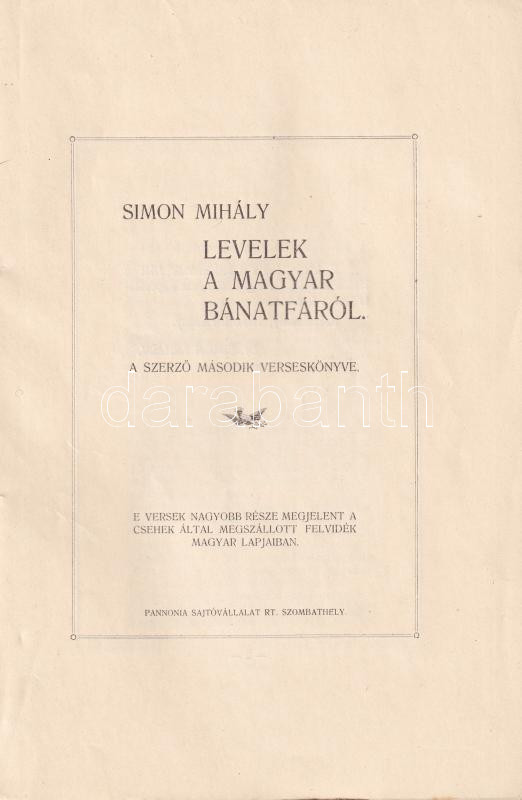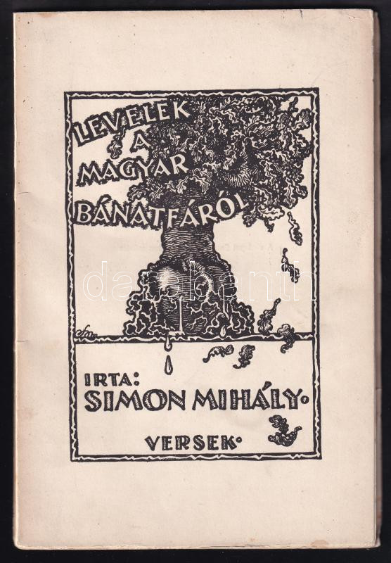 Simon Mihály: Levelek a magyar bánatfáról. A szerző második verseskönyve. E versek nagyobb része megjelent a csehek által megszállott Felvidék magyar lapjaiban. Szombathely,1924,Pannnia, 64 p. A borító Somos István grafikusművész munkája. Kiadói papírkötés.