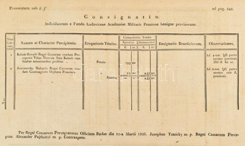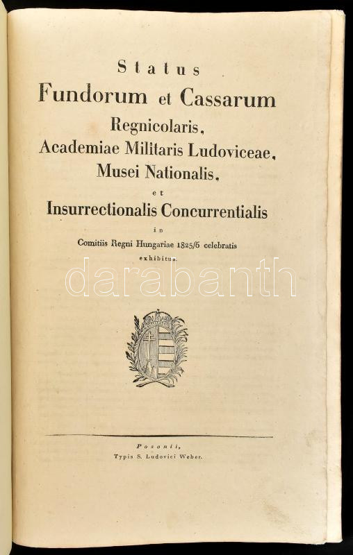 Status Fundorum et Cassarum Regnicolaris, Academiae Militaris Ludoviceae, Musei Nationalis, et Insurrectionalis Concurrentialis in comitiis Regni Hungariae 1825/6 celebratis exhibitus. Posonii, Typis S. Ludovici Weber. Latin nyelven. Átkötött modern kartonált papírkötésben, 4-13. oldalak között hiányzó lapokkal, a 13/14. oldalt követően hibás számozással: két 15/16. számozású lap jön.