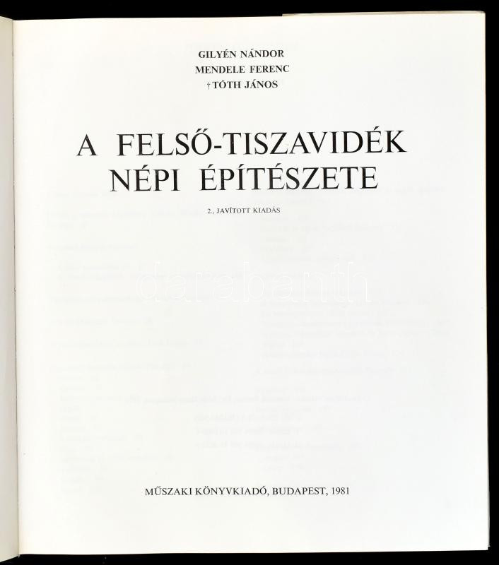 Gilyén Nándor - Mendele Ferenc - Tóth János: A Felső-Tiszavidék népi építészete. Bp., 1981, Műszaki Könyvkiadó. Második kiadás. Fekete-fehér képekkel illusztrált. Kiadói egészvászon-kötés, kiadói papír védőborítóban. Megjelent 5200 példányban.