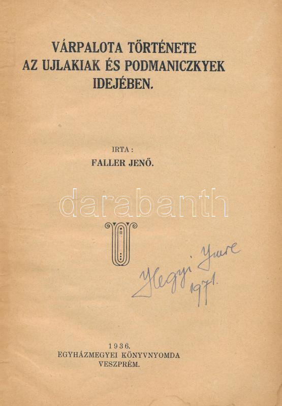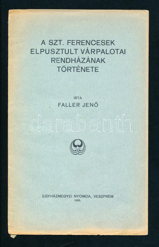 Faller Jenő 3 műve Várpalotáról: A Szt. Ferencesek elpusztult várpalotai rendházának története. A szerző, Faller Jenő (1894-1966) okleveles bányamérnök által Supka Géza (1883-1956) régész, művészettörténész részére DEDIKÁLT példány. Veszprém, 1936., Egyházmegyei Nyomda, 18 p. Kiadói papírkötés, ceruzás aláhúzásokkal.; Várpalota története az Újlakiak és Podmaniczkyak idejében. Veszprém, 1936., Egyházmegyei Nyomda, 60 p. Átkötött kopott félvászon-kötés, foltos lapokkal, ceruzás aláhúzásokkal és bejelölésekkel, intézményi bélyegzésekkel. Jegyzetek a várpalotai százéves róm. kat. iskola történetéhez. Veszprém, 1935., Egyházmegyei Nyomda, ceruzás aláhúzásokkal, 13 p.