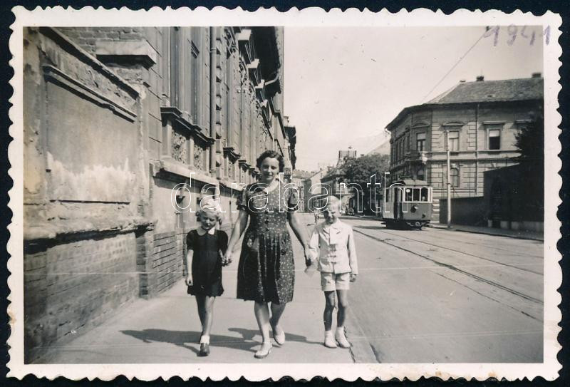 1941 Budapest, sétáló család, háttérben az 56-os villamos, 6×9 cm https://www.darabanth.com/de/437-Fernauktion/437.0/Fotografie/Foto~500023/1941-Budapest-setalo-csalad-hatterben-az-56-os-villamos-6C3979-cm~II2842562