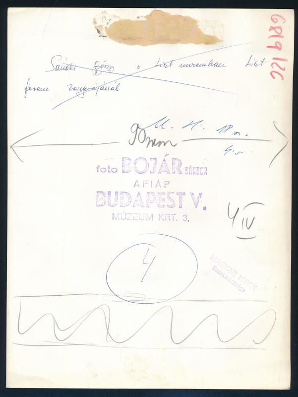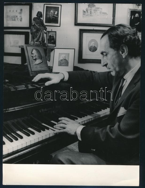 1968 Sándor György a Liszt Múzeumban, Liszt Ferenc zongorájával, sajtófotó, a hátoldalon feliratozott, pecséttel jelzett (Magyar Hírek - Bojár Sándor felvétele), 24x18 cm