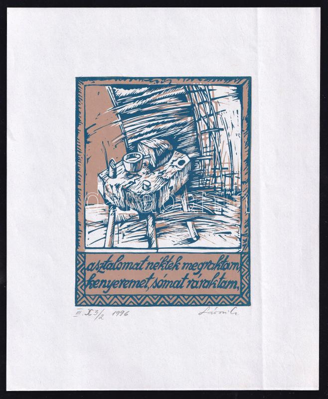 Beschreibung: Sárosi Csaba (1951-). "Asztalomat néktek (...)" (Magyarság-sorozat III.), 1996. Linómetszet, papír, jelzett. 15x12 cm
