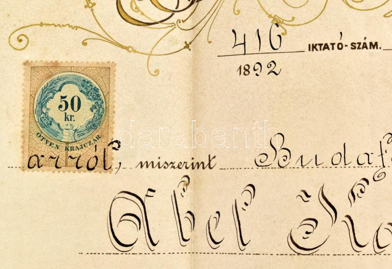 1892 Bp., a Budapesti Mészáros Ipartestület által kiállított, rendkívül dekoratív bizonyítvány, Ábel Károly János mészárossegéd részére; aláírásokkal, szárazpecséttel, 50 kr okmánybélyeggel. Hajtva, lapszéli szakadásokkal, 60x42 cm