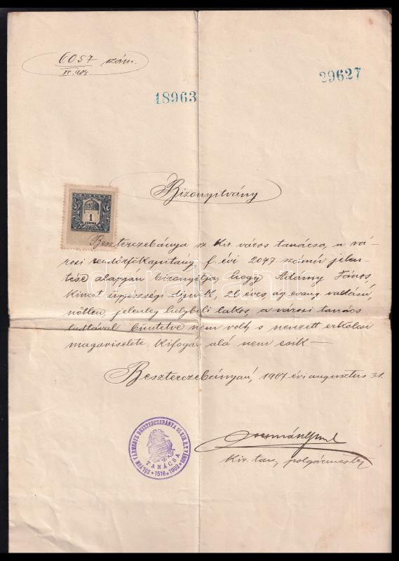 Beschreibung: 1907 Csesznák Gyula, Besztercebánya polgármestere által aláírt okirat
