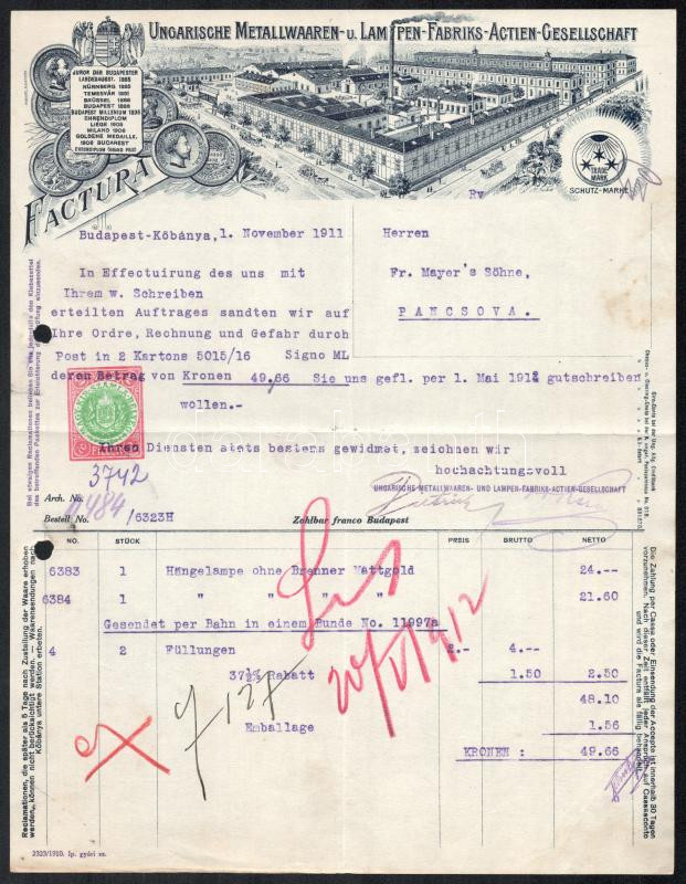 Beschreibung: 1911 Budapest, Kőbánya, Ingarische Metallwaaren- und Lampen-Fabriks-Actien-Gesellschaft fejléces számla, rajta a gyár látképével