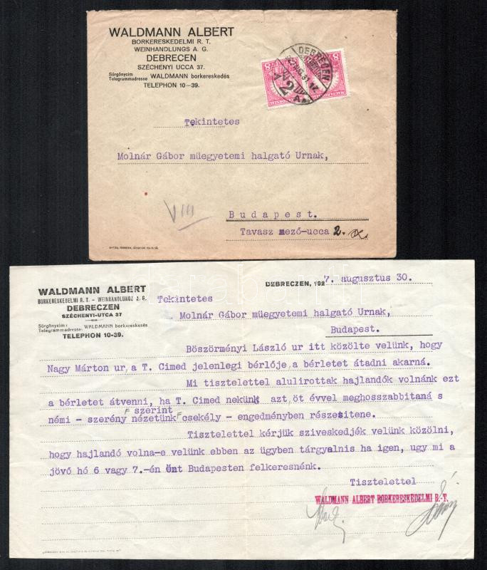 Beschreibung: 1927 Waldmann Albert borkereskedő R.T., Debrecen, püspöki palota: levél bérlemény ügyében, fejléces papíron, eredeti fejléces levélborítékban