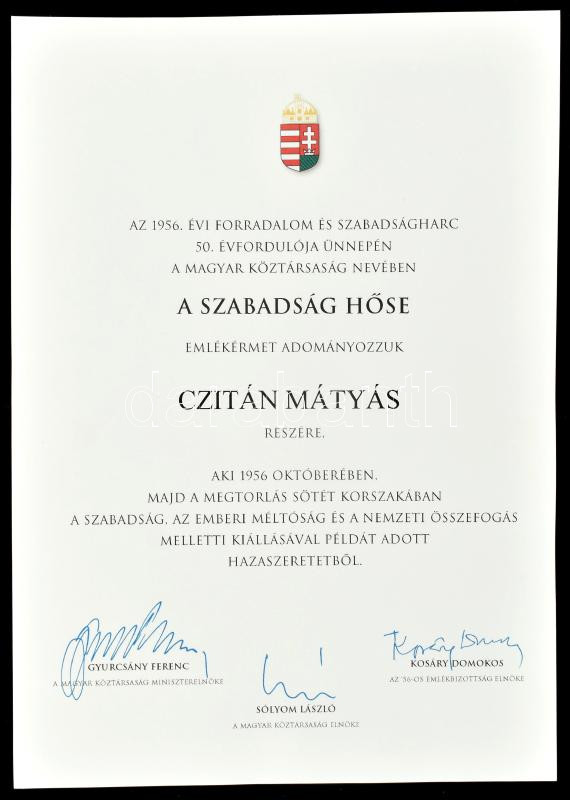 2006 Az 1956-os forradalom 50. évfordulójára alapított Szabadság Hőse emlékérem adományozó oklevele, Gyurcsány Ferenc miniszterelnök, Sólyom László köztársasági elnök és Kosáry Domokos, az '56-os emlékbizottság elnökének aláírásával, eredeti mappában