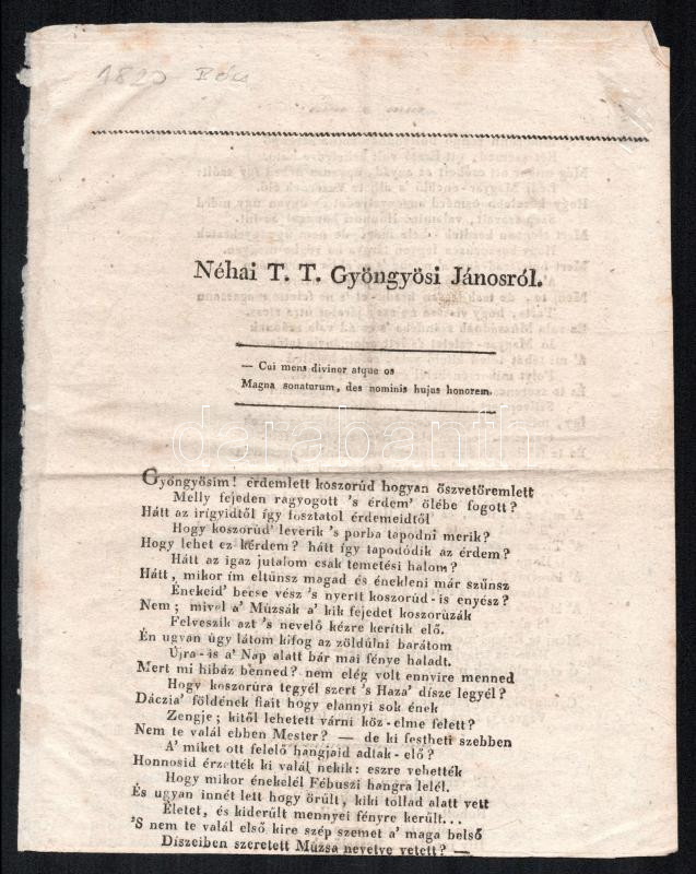 1820 Néhai T. T. Gyöngyösi Jánosról c. vers 4p. Hátoldalán csokoládé r... https://www.darabanth.com/de/437-Fernauktion/437.0/Kunst-Dokumente-andere-Sammelgebiete/Drucksachen~1000009/1820-Nehai-T-T-Gyongyosi-Janosrol-c-vers-4p-Hatoldalan-csokolade-reklammal~II2849401