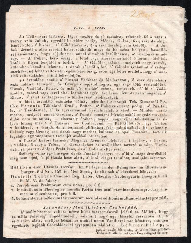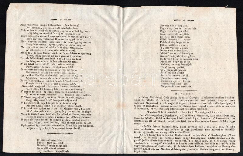 Beschreibung: 1820 Néhai T. T. Gyöngyösi Jánosról c. vers 4p. Hátoldalán csokoládé reklámmal