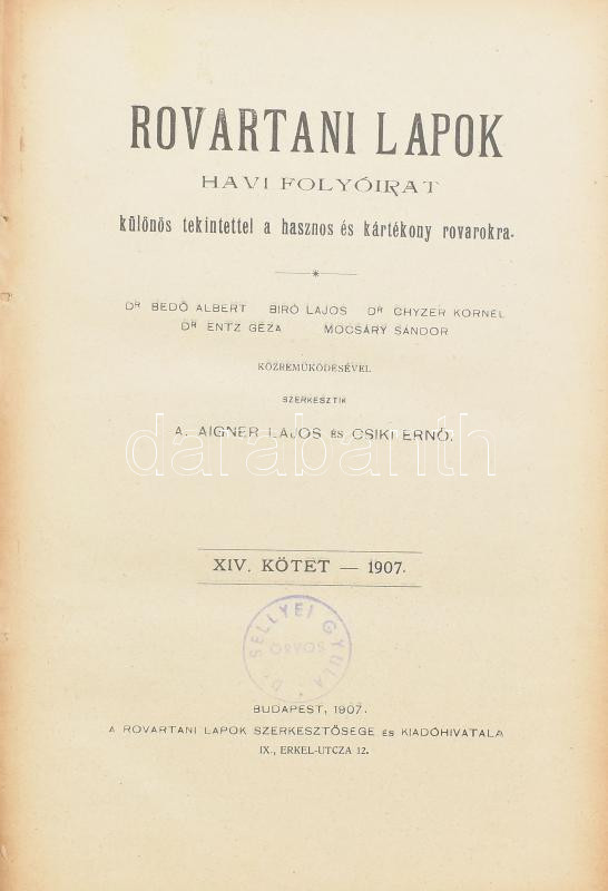 1907 Rovartani lapok, szerk.: Csiki Ernő, XIV kötet, , korabeli vaknyo... https://www.darabanth.com/de/437-Fernauktion/437.0/Kunst-Dokumente-andere-Sammelgebiete/Drucksachen~1000009/1907-Rovartani-lapok-szerk-Csiki-Erno-XIV-kotet-korabeli-vaknyomasos-egeszvaszon-kotes~II2849244