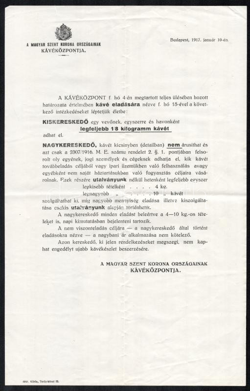 1917 Magyar Szent Korona Országainak kávéközpontja hirdetménye kávé el... https://www.darabanth.com/de/437-Fernauktion/437.0/Kunst-Dokumente-andere-Sammelgebiete/Drucksachen~1000009/1917-Magyar-Szent-Korona-Orszagainak-kavekozpontja-hirdetmenye-kave-eladasrol-20x30-cm~II2850566