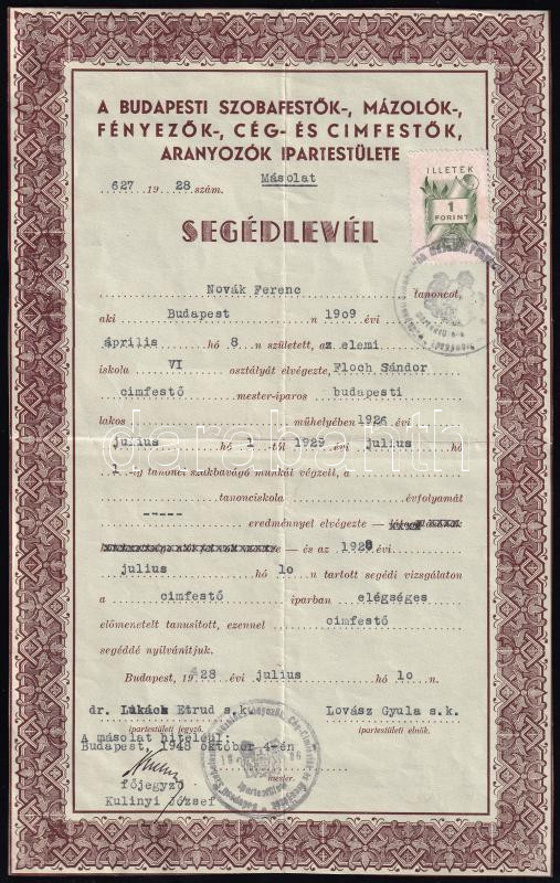 1928 Budapesti Szobafestők, Mázolók, Aranyozók Ipartestületének segédl... https://www.darabanth.com/de/437-Fernauktion/437.0/Kunst-Dokumente-andere-Sammelgebiete/Drucksachen~1000009/1928-Budapesti-Szobafestok-Mazolok-Aranyozok-Ipartestuletenek-segedlevele-cimfesto-szamC3~II2840064