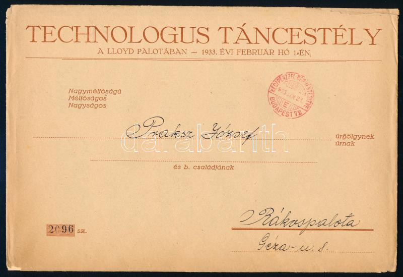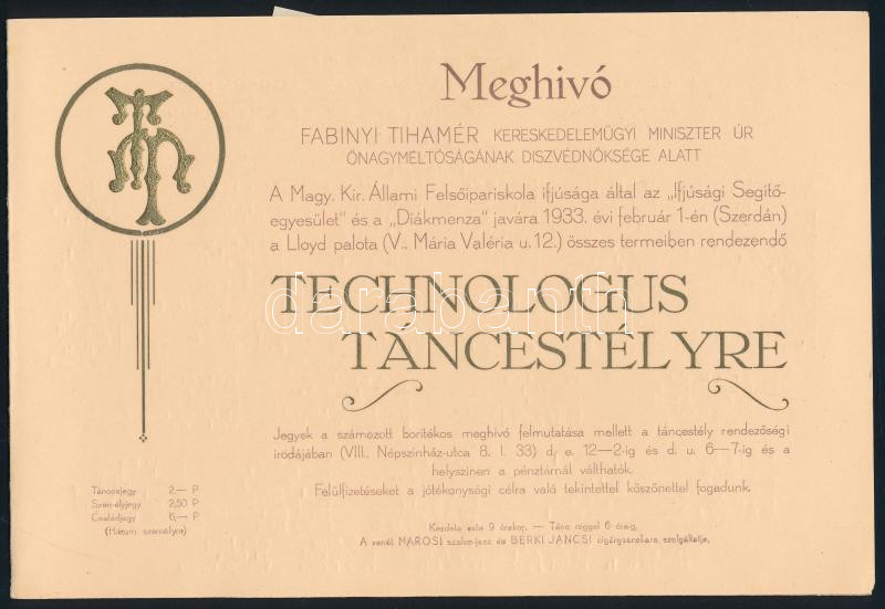 1933 Meghívó technologus táncestélyre, Lloyd palota, Bp., V., Mária Valéria u. 12., dombornyomott art deco ornamentikával díszített, 4 sztl oldal és 1 db melléklet hártyapapíron, eredeti számozott, futott borítékban, 16x24 cm.