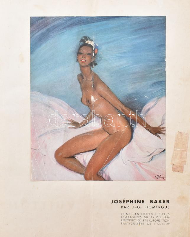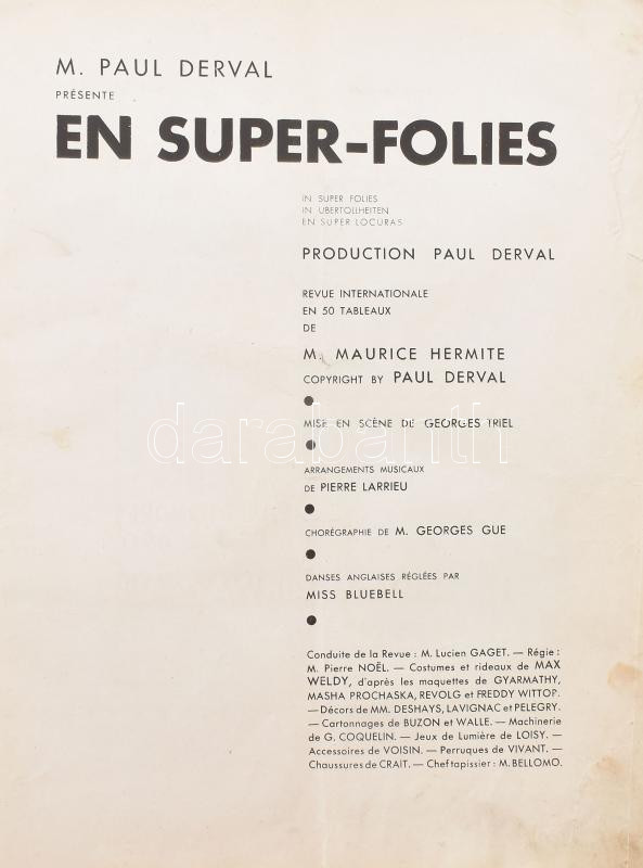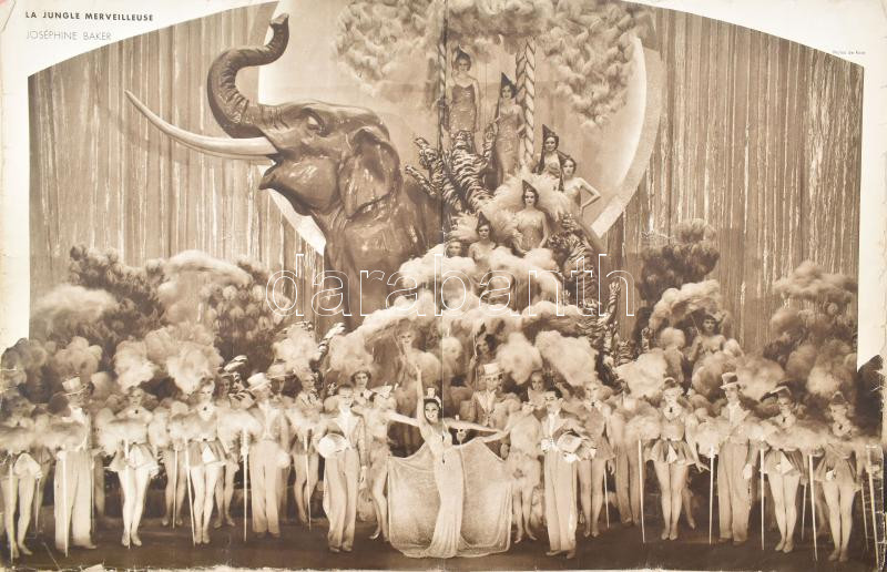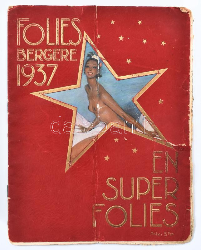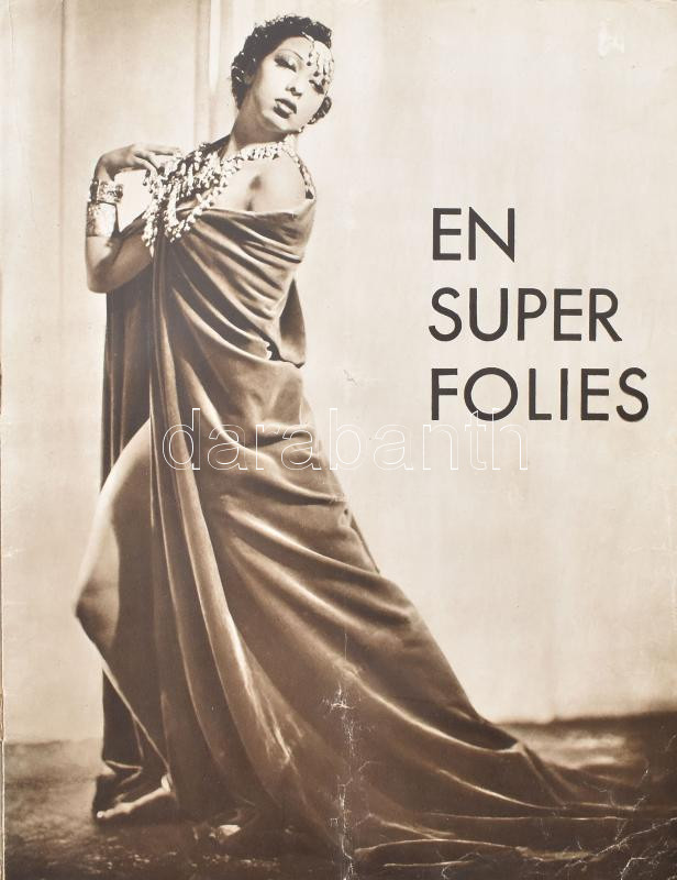 1937 Folies Bergere En Super Folies, francia mulató programfüzete. Benne Josephine Baker-rel, és egy Louis Vuitton reklámmal. Francia nyelven, rengeteg fotóval, korabeli reklámokkal, rossz állapotban, kopott borítóval, hajtott, sérült, kijáró lapokkal.