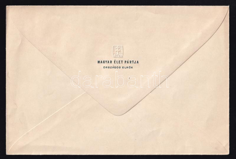 1938 Magyar Élet Pártja, országos elnök fejléces levélboríték, 14x21 c... https://www.darabanth.com/de/437-Fernauktion/437.0/Kunst-Dokumente-andere-Sammelgebiete/Drucksachen~1000009/1938-Magyar-Elet-Partja-orszagos-elnok-fejleces-levelboritek-14x21-cm~II2843262