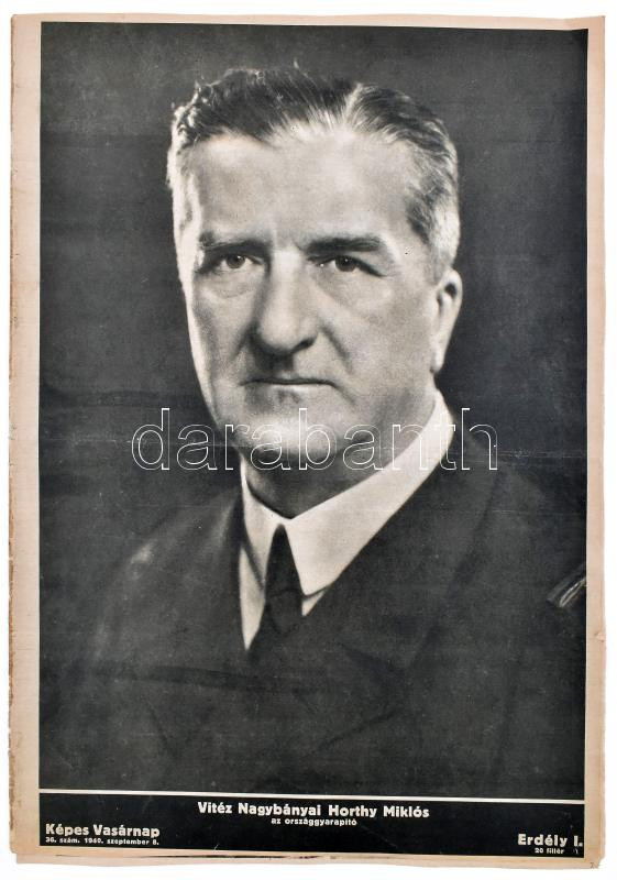 1940 Képes Vasárnap az erdélyi bevonulás alkalmából kiadott száma, 1940. szept. 8., számos fekete-fehér fotóval (Békás-szoros, Borszék, Tusnádfürdő), érdekes írásokkal (Cholnoky Jenő: Erdély), a címlapon Horthy Miklós, kissé sérült, 16 p.