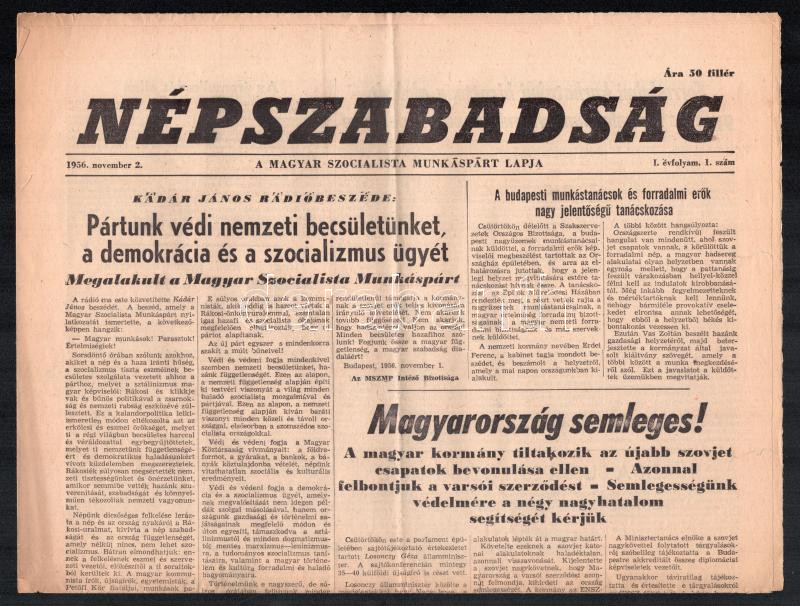1956 Népszabadság. I. évf. 1. sz. https://www.darabanth.com/de/437-Fernauktion/437.0/Kunst-Dokumente-andere-Sammelgebiete/Drucksachen~1000009/1956-Nepszabadsag-I-evf-1-sz~II2852627
