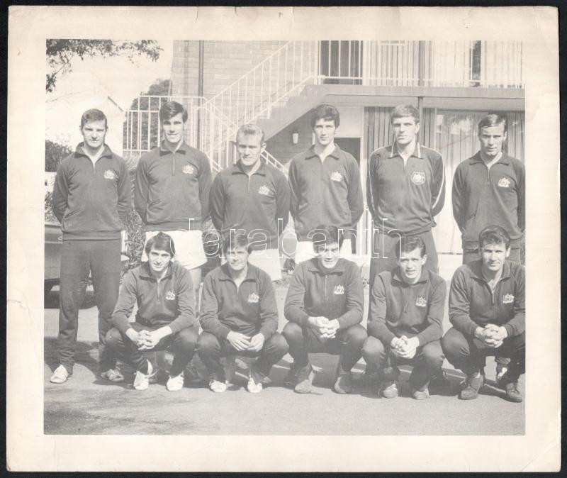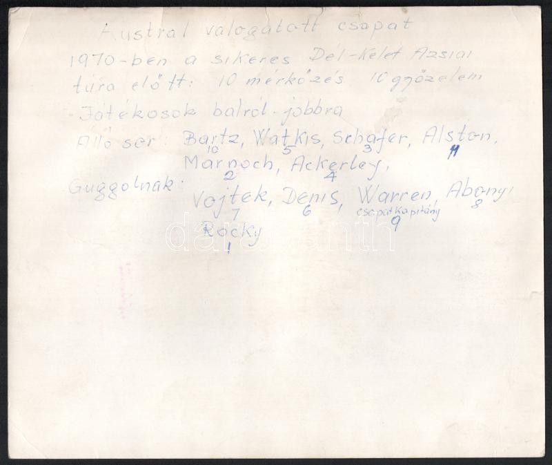 1970 Az ausztrál labdarúgó-válogatott játékosai a sikeres délkelet-ázsiai túra előtt (10 mérkőzés, 10 győzelem), köztük Johnny Warren csapatkapitány és a magyar származású Abonyi Attila; fotó, a hátoldalon feliratozva, 25x21 cm