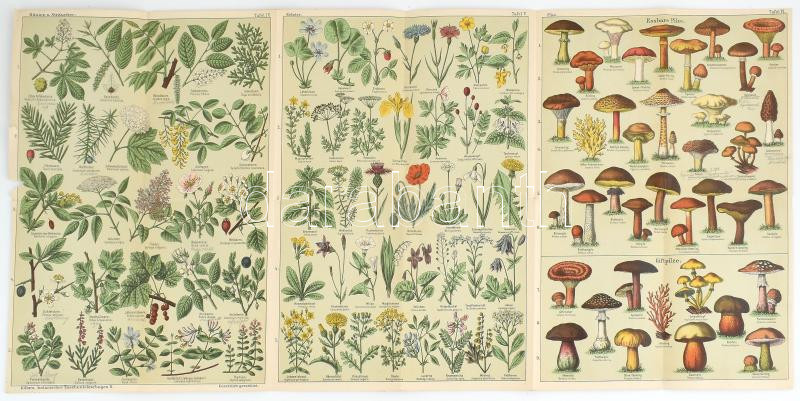 cca 1900-1910 Virágok, gyógynövények, gombák. Nagyméretű, kihajtható képtábla. Kühn's botanischer Taschenbilderbogen II. Tafel IV-VI. Színes litográfia, papír, 77x34 cm